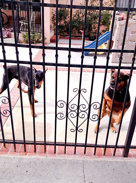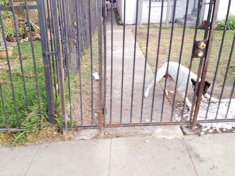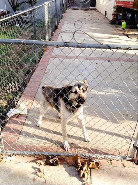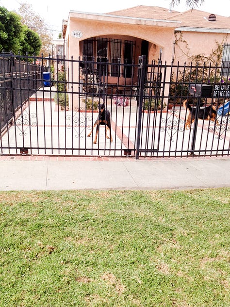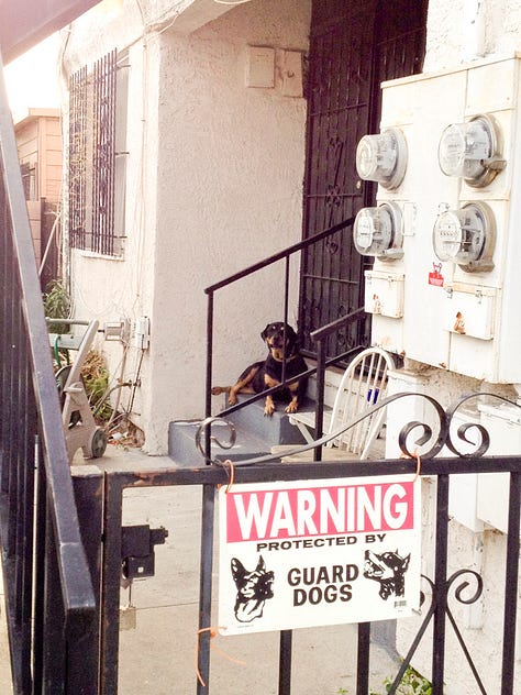 But more specifically, it started in about 2011 when I lived in West Adams. I had a German Shepherd named Bruce. The neighborhood is historic and had classic suburban bungalows with decorative iron fences. There’s always dogs in the front yards and when I walked Bruce around they’d charge the fence and bark and bite at us. I started taking pictures with my phone. The images had a nice juxtaposition of idyllic suburban settings and the angry dogs. I was also reading Don Delillo’s White Noise at the time and he makes note of dogs barking in the neighborhood to create an atmosphere of unrest. Dogs are an extension of our own attitudes and emotions and I liked the underlying anxiety and anger that persists in a seemingly idyllic environment. Bin Laden was assassinated in 2011 with the help of a Belgian Malinois. Police still use dogs because robots can’t sense human pain and emotion like a dog. The dog is more effective than technology. I painted a big airbrush portrait of a german shepherd barking in what could be a pet or a military dog.